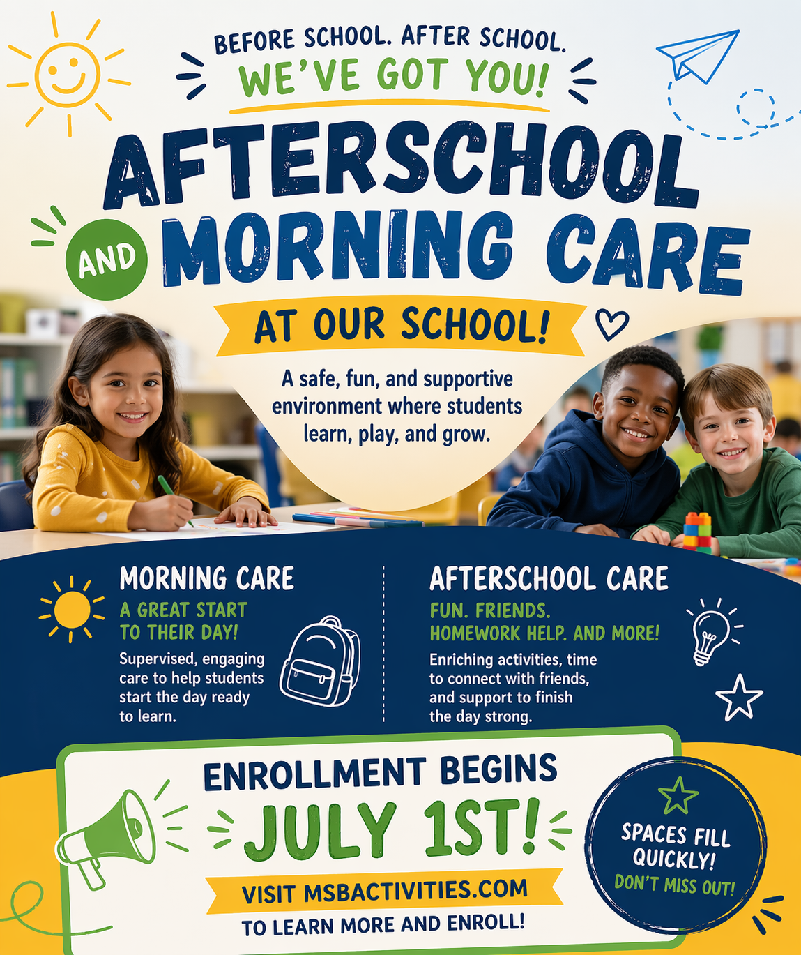 OEN Before/After Care For the SY 2026-2027 Registration April 21, 2026 OEN Before/Aftercare Program for the 2026-2027 School Year. Registration opens July 1, 2026. Register on MSBActivities.com Related Files Registration.png (1.7 MBs) Permalink: https://www.cmecharter.net/2026/4/oen-before-after-care